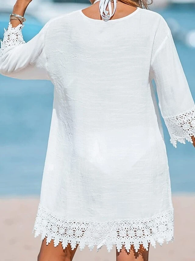 Women’s Beach Dress Beach Wear Mini Dress Lace Casual Plain V Neck 3/4 Length Sleeve Vacation Going Out Almond 2023 Summer Spring S M L XL