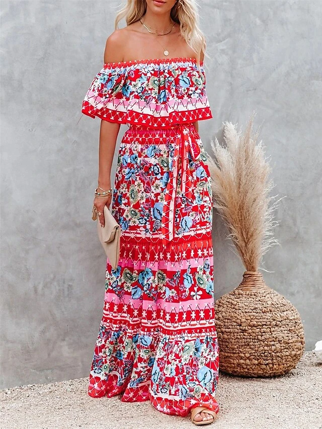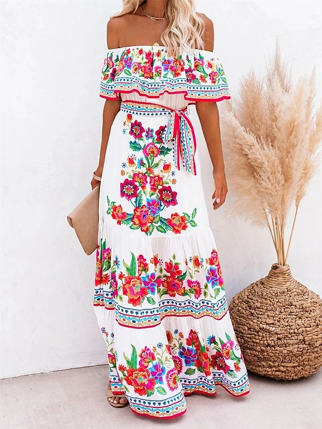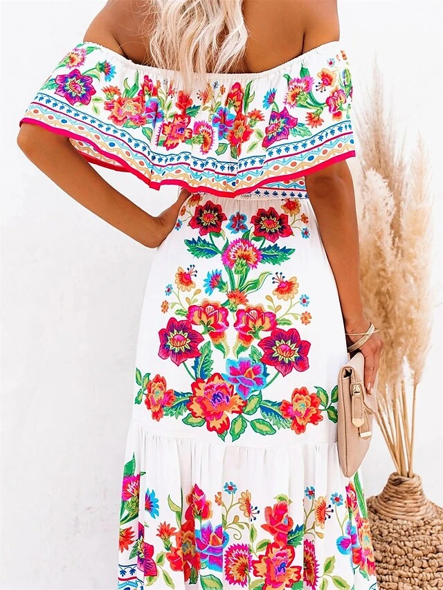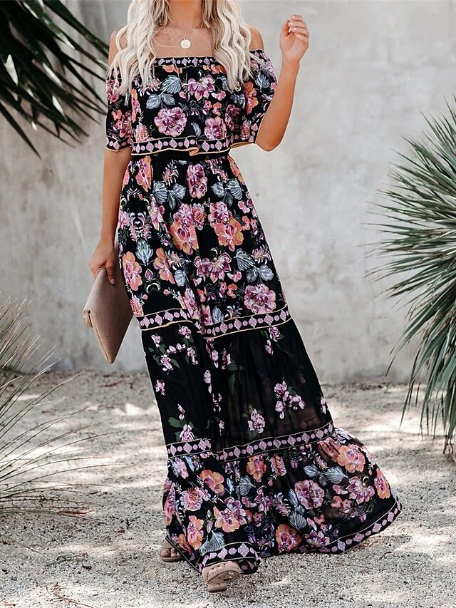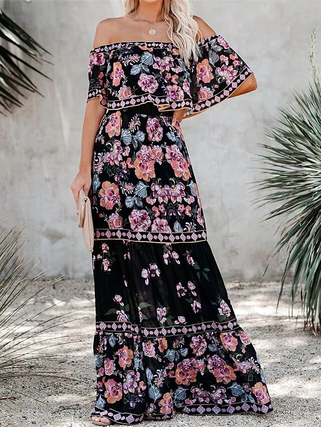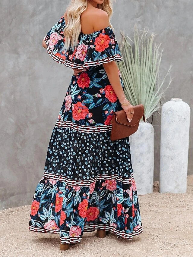 Women’s Boho Dress Beach Dress Beach Wear Long Dress Maxi Dress Ruffle Print Boho Casual Floral Off Shoulder Short Sleeve Loose Fit Outdoor Daily Black White 2023 Spring Summer S M L XL