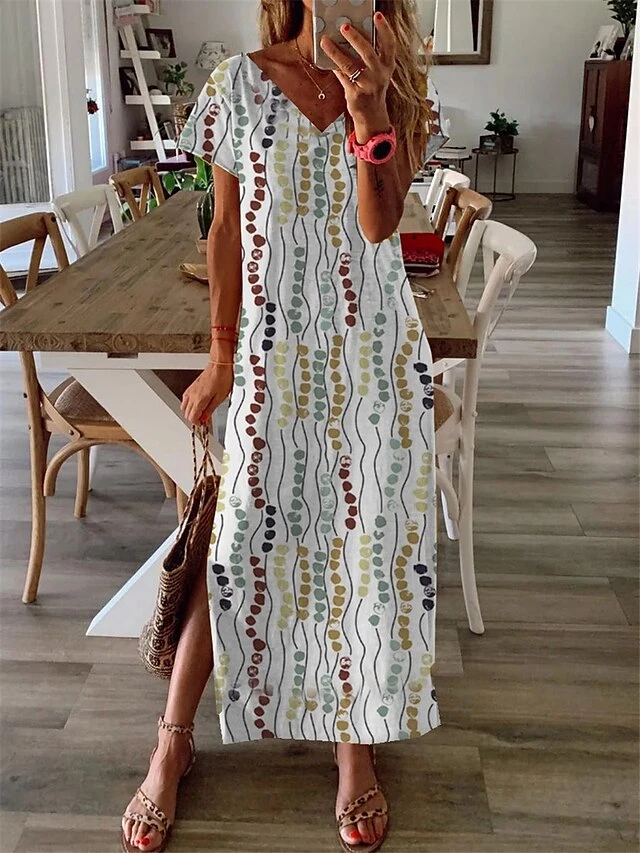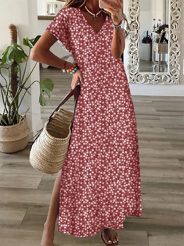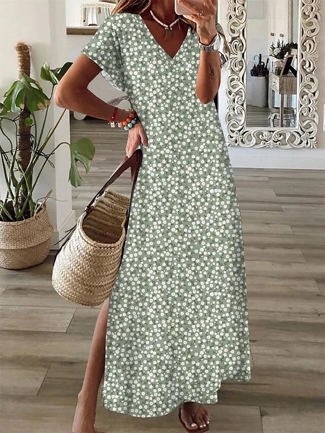 Women’s Casual Dress A Line Dress Floral Dress Floral Ditsy Floral Split Print V Neck Long Dress Maxi Dress Fashion Streetwear Outdoor Daily Short Sleeve Regular Fit Black White Burgundy Summer Spring