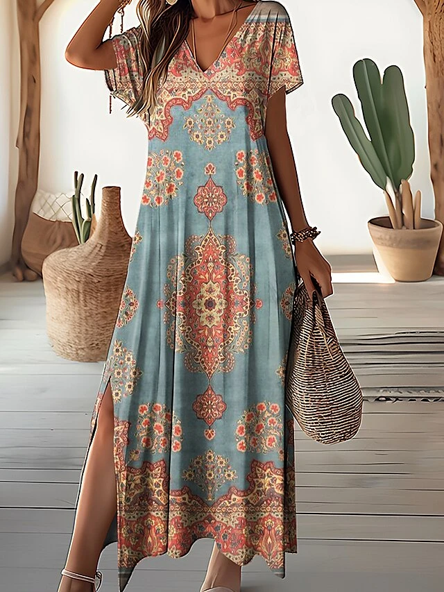 Women’s Casual Dress A Line Dress Summer Dress Floral Split Print V Neck Long Dress Maxi Dress Fashion Streetwear Outdoor Daily Short Sleeve Regular Fit Yellow Pink Blue Summer Spring S M L XL XXL