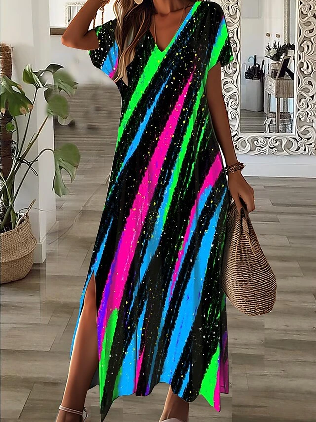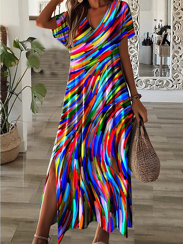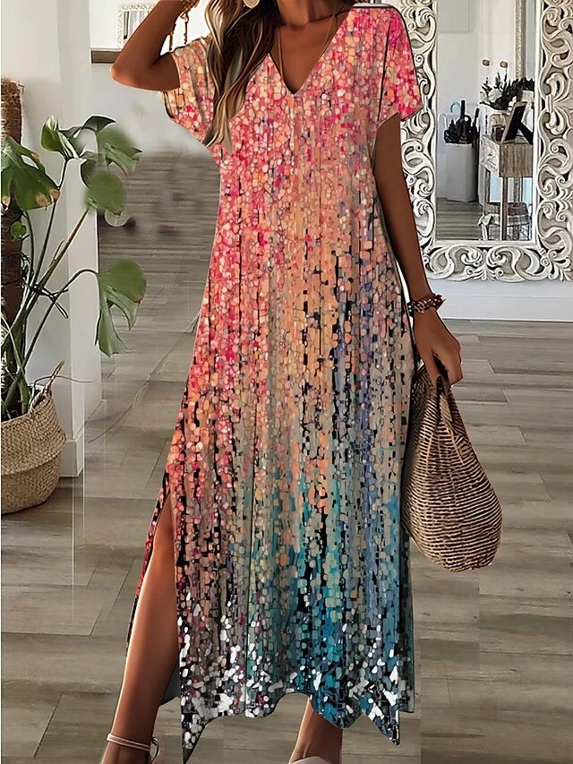 Women’s Casual Dress A Line Dress Summer Dress Graphic Split Print V Neck Long Dress Maxi Dress Fashion Streetwear Outdoor Daily Short Sleeve Regular Fit Blue Purple Summer Spring S M L XL XXL