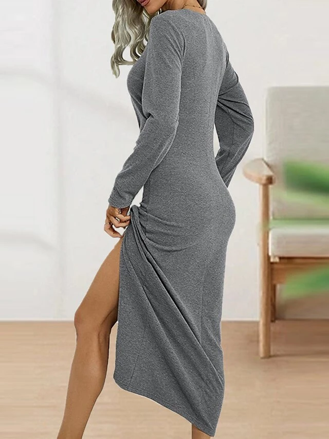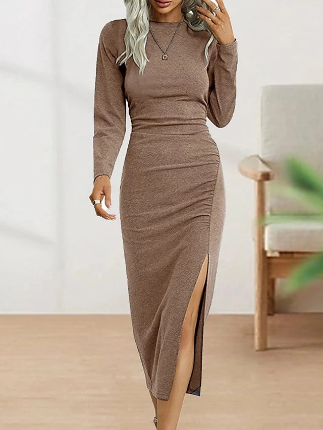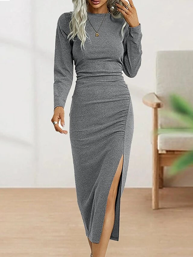 Women’s Casual Dress Bodycon Sheath Dress Midi Dress Split Outdoor Street Daily Fashion Streetwear Crew Neck Long Sleeve 2023 Regular Fit Black Wine Green Color S M L XL XXL Size