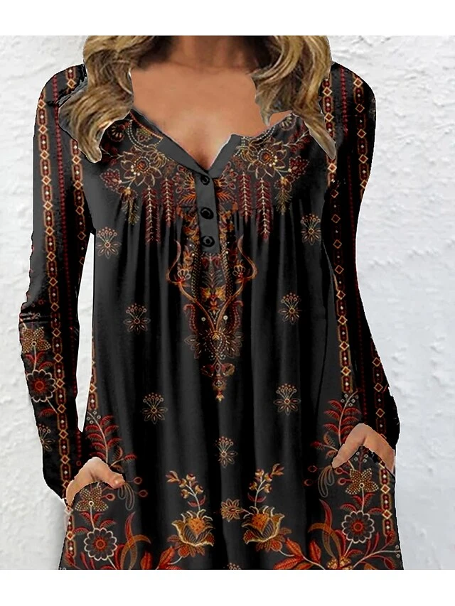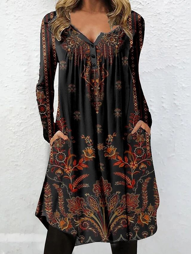 Women’s Casual Dress Ethnic Dress Shift Dress Mini Dress Black Long Sleeve Floral Button Winter Fall Spring V Neck Stylish Weekend 2023 S M L XL XXL 3XL