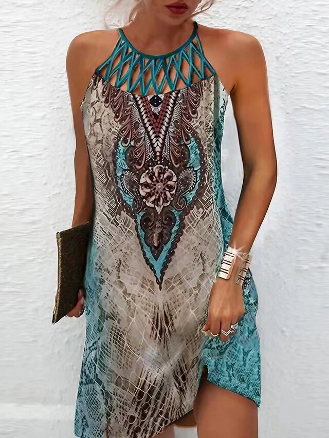 Women’s Casual Dress Ethnic Dress Shift Dress Tribal Backless Print Halter Mini Dress Fashion Ethnic Outdoor Daily Sleeveless Regular Fit Dusty Blue Summer Spring S M L XL XXL