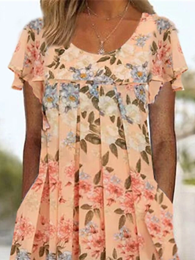 Women’s Casual Dress Floral Dress Summer Dress Floral Ruched Pocket Crew Neck Midi Dress Active Fashion Outdoor Daily Short Sleeve Regular Fit Orange Summer Spring S M L XL XXL