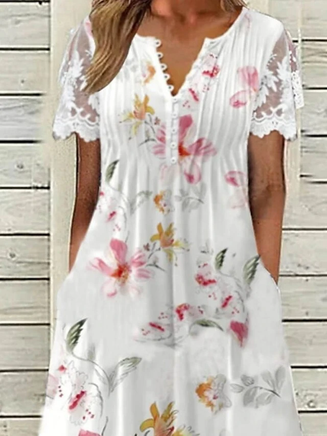 Women’s Casual Dress Lace Dress Summer Dress Floral Lace Pleated V Neck Midi Dress Fashion Modern Date Weekend Short Sleeve Regular Fit White Spring Summer S M L XL XXL