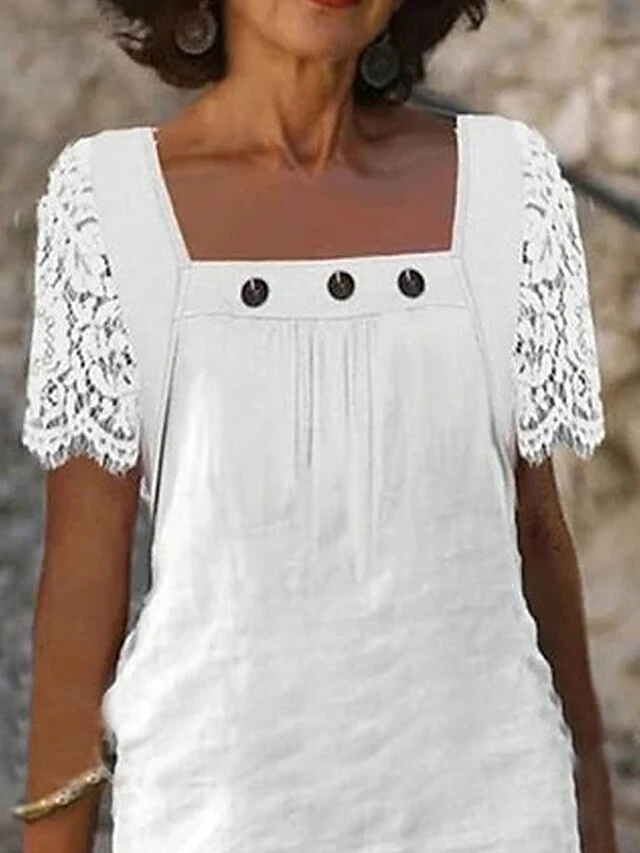 Women’s Casual Dress Lace Dress White Dress Midi Dress Lace Patchwork Daily Date Going Out Fashion Basic Square Neck Short Sleeve 2023 Loose Fit White Color S M L XL XXL Size