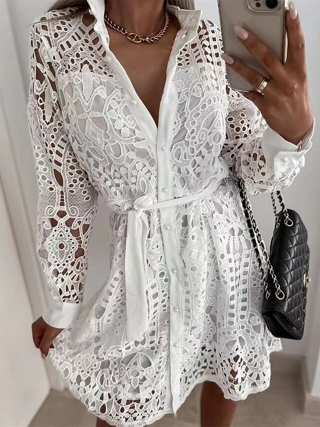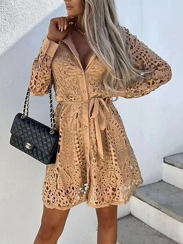 Women’s Casual Dress Lace Dress Winter Dress Mini Dress Lace Up Lace Street Daily Holiday Fashion Streetwear V Neck Long Sleeve 2023 Regular Fit Black White Khaki Color S M L XL XXL Size