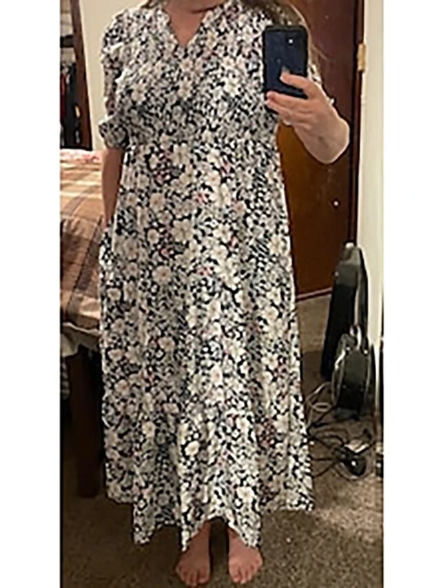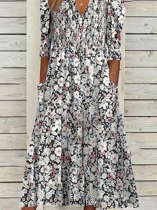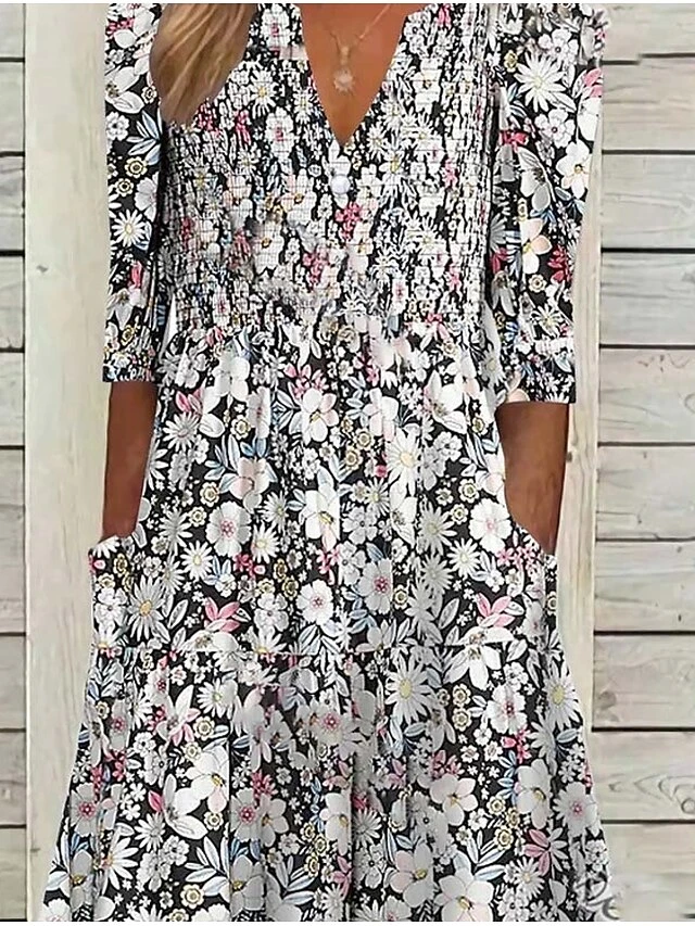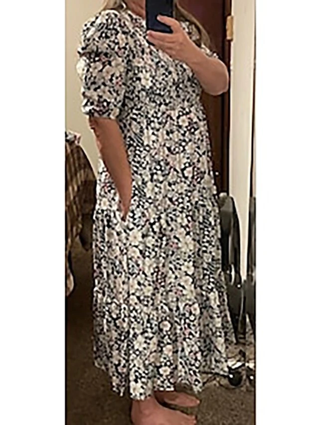 Women’s Casual Dress Midi Dress Black Short Sleeve Floral Print Spring Summer V Neck Basic 2023 S M L XL XXL 3XL
