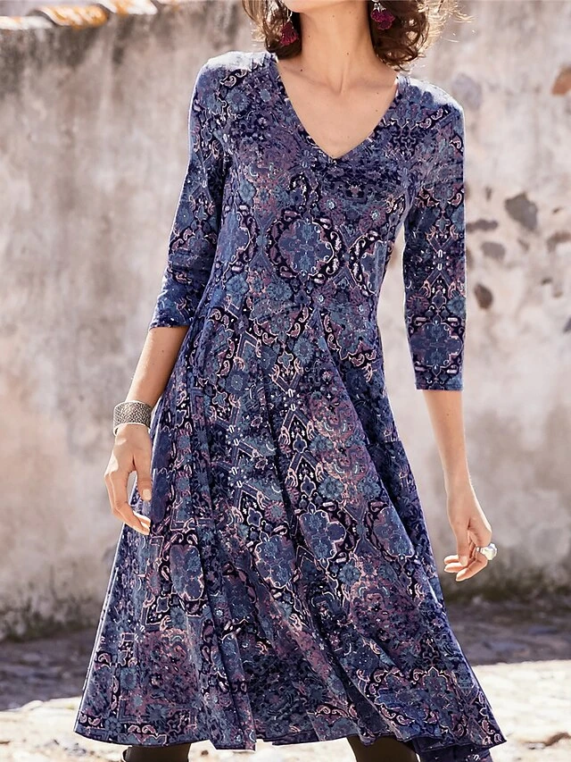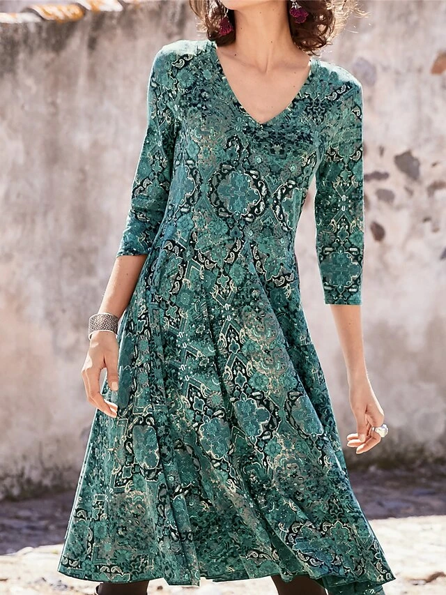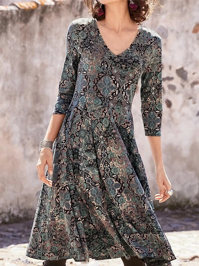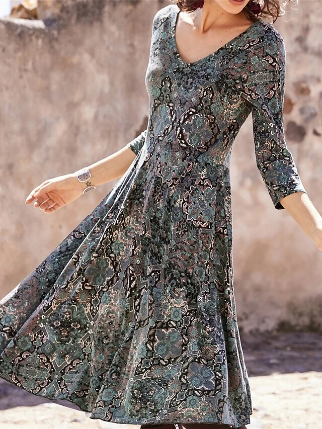 Women’s Casual Dress Paisley Dress Ethnic Dress Floral Paisley Print V Neck Midi Dress Vintage Ethnic Outdoor Daily 3/4 Length Sleeve Regular Fit Dark Green Purple Orange Spring Fall S M L XL XXL