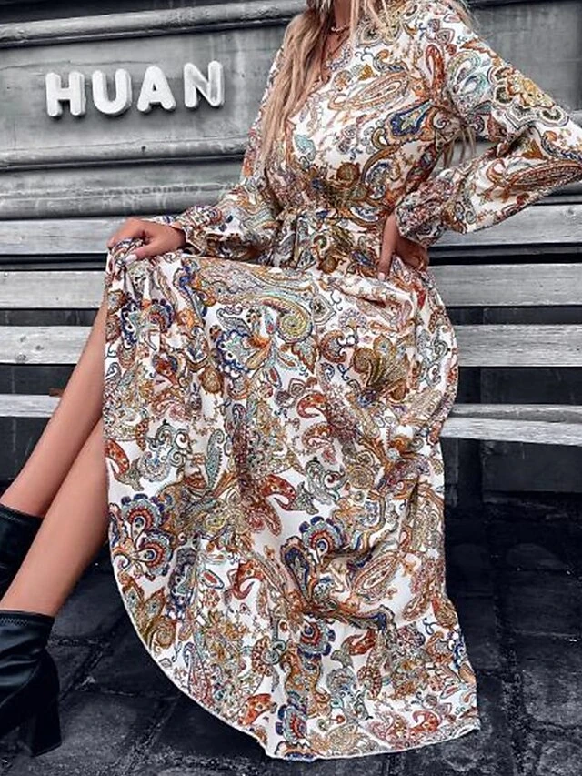 Women’s Casual Dress Paisley Dress Swing Dress Floral Paisley Print V Neck Midi Dress Fashion Streetwear Outdoor Street Long Sleeve Loose Fit White Spring Fall S M L XL