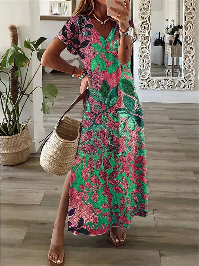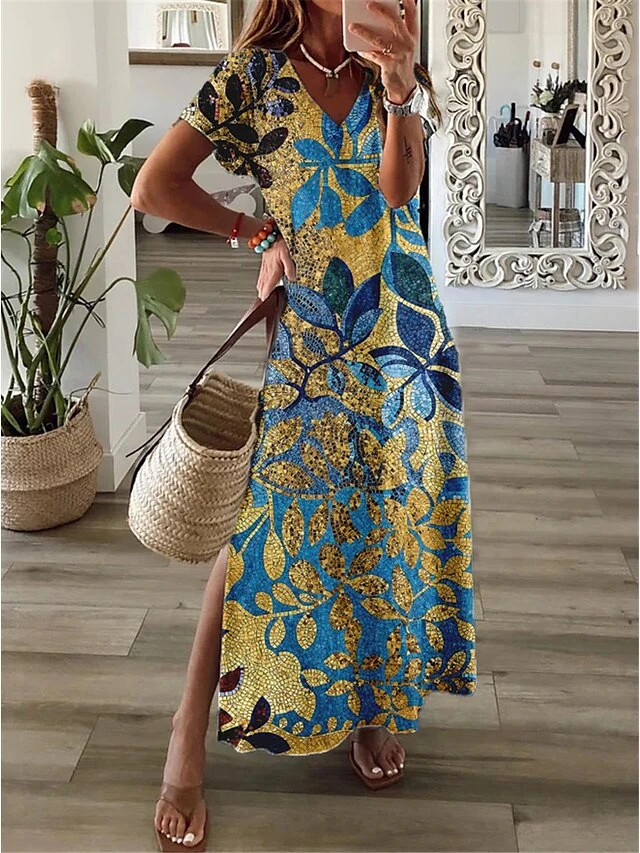 Women’s Casual Dress Shift Dress Long Dress Maxi Dress Yellow Fuchsia Green Short Sleeve Floral Split Summer Spring V Neck Vacation 2023 S M L XL XXL 3XL