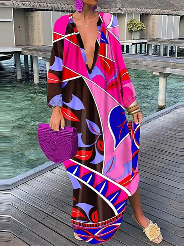 Women’s Casual Dress Shirt Dress Shift Dress Long Dress Maxi Dress Yellow Fuchsia Long Sleeve Floral Button Winter Fall Deep V Mature Winter Dress Weekend Fall Dress Loose Fit 2023 S M L XL XXL 3XL