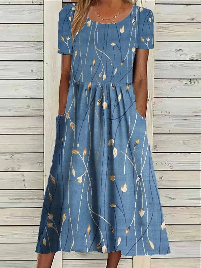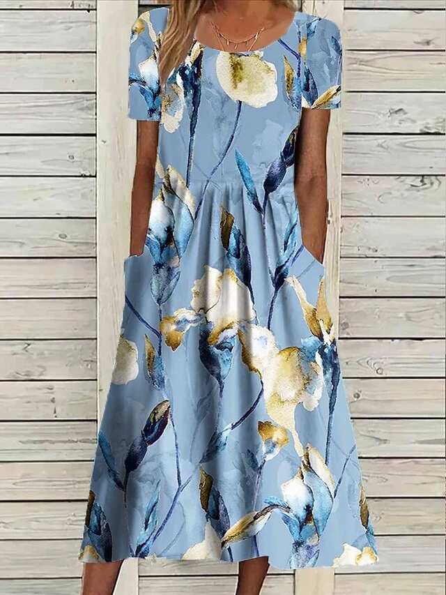 Women’s Casual Dress Summer Dress Print Dress Floral Pocket Print Crew Neck Midi Dress Fashion Streetwear Outdoor Daily Short Sleeve Loose Fit White Blue Dark Blue Summer Spring S M L XL XXL