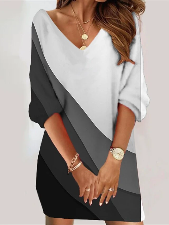 Women’s Casual Dress Sweatshirt Dress Summer Dress Geometric Color Block Print V Neck Mini Dress Fashion Streetwear Outdoor Daily 3/4 Length Sleeve Loose Fit Black And White White Dark Gray Summer