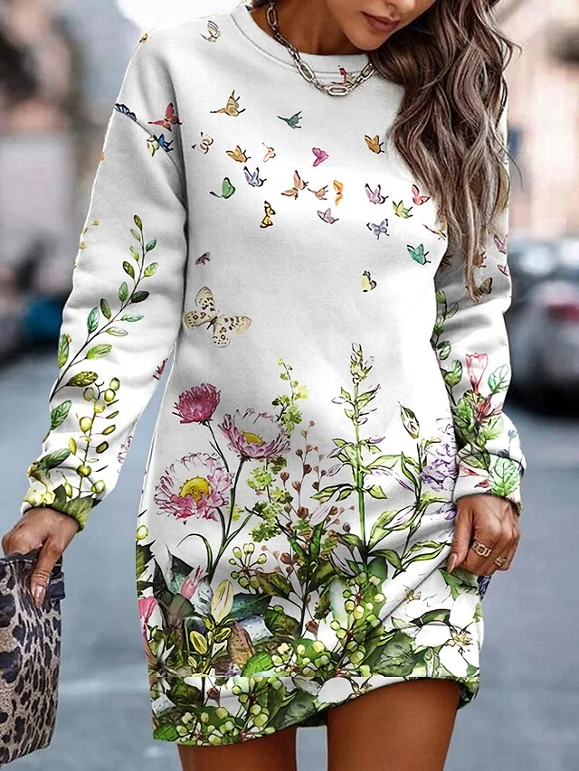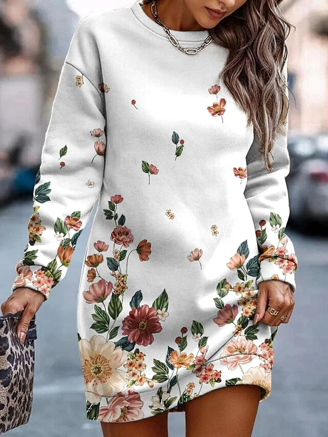Women’s Casual Dress Sweatshirt Dress Winter Dress Floral Print Crew Neck Mini Dress Fashion Streetwear Outdoor Daily Long Sleeve Loose Fit White Red Green Fall Winter S M L XL XXL