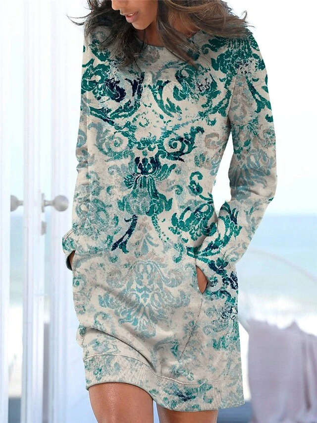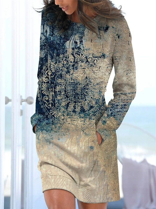 Women’s Casual Dress Sweatshirt Dress Winter Dress Floral Tribal Pocket Print Crew Neck Mini Dress Vintage Ethnic Outdoor Daily Long Sleeve Loose Fit Royal Blue Blue Dusty Blue Fall Winter S M L XL
