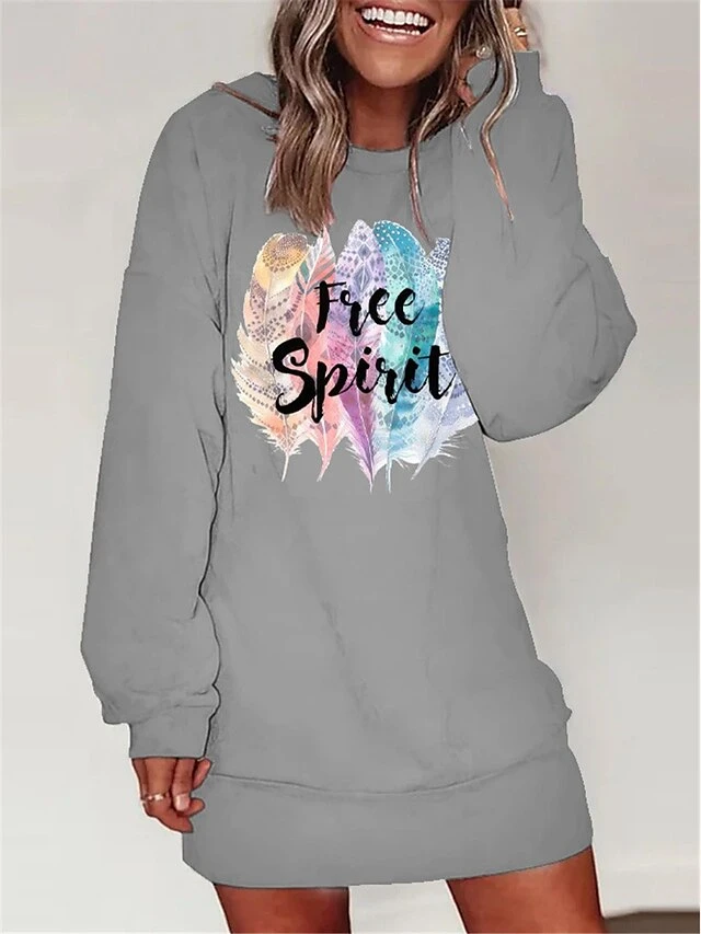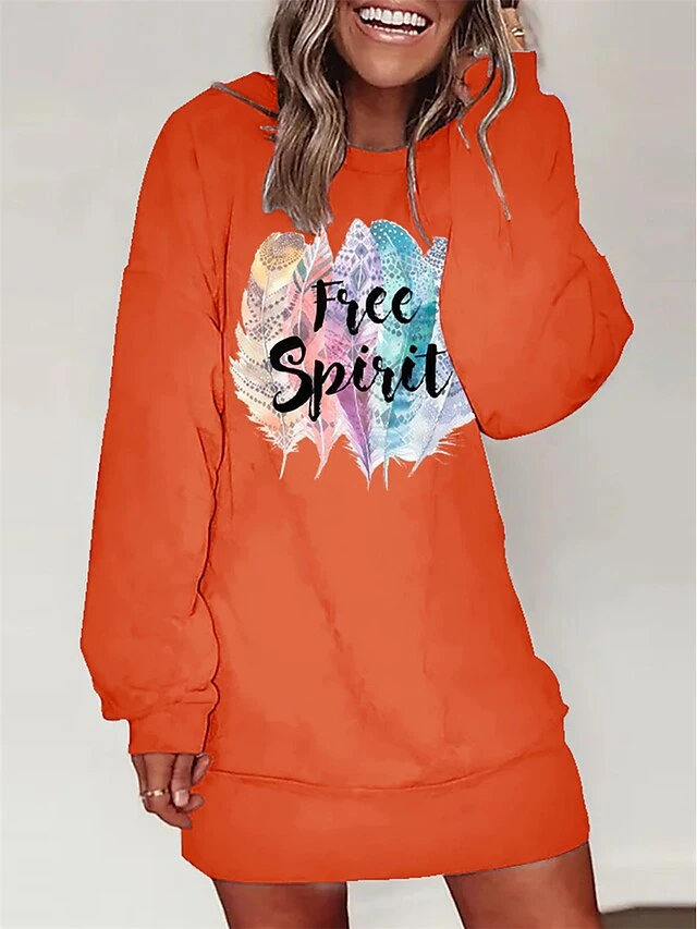 Women’s Casual Dress Sweatshirt Dress Winter Dress Letter Feather Print Crew Neck Mini Dress Fashion Streetwear Outdoor Daily Long Sleeve Loose Fit White Blue Orange Fall Winter S M L XL XXL