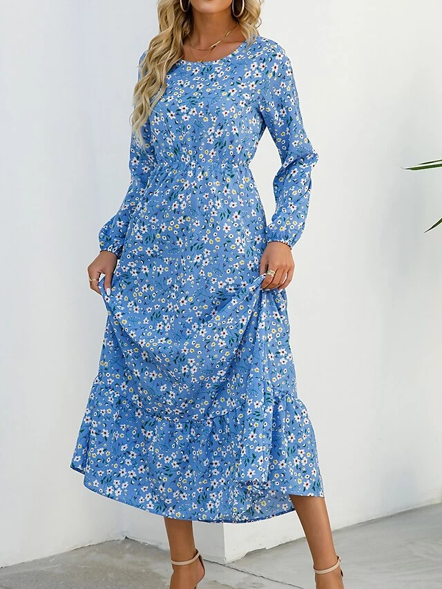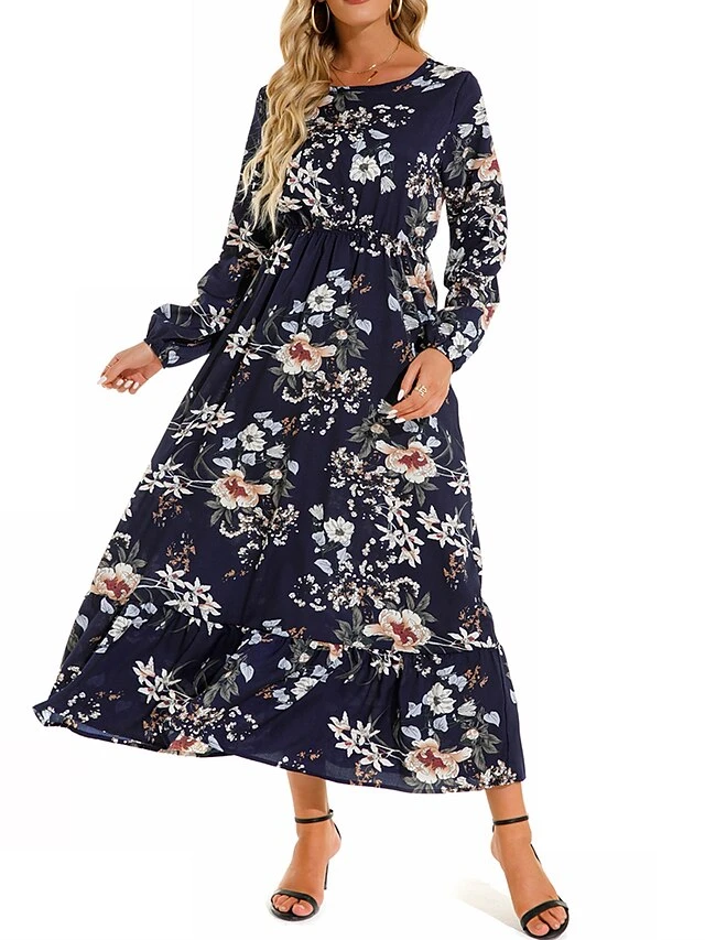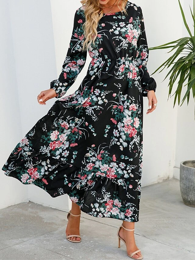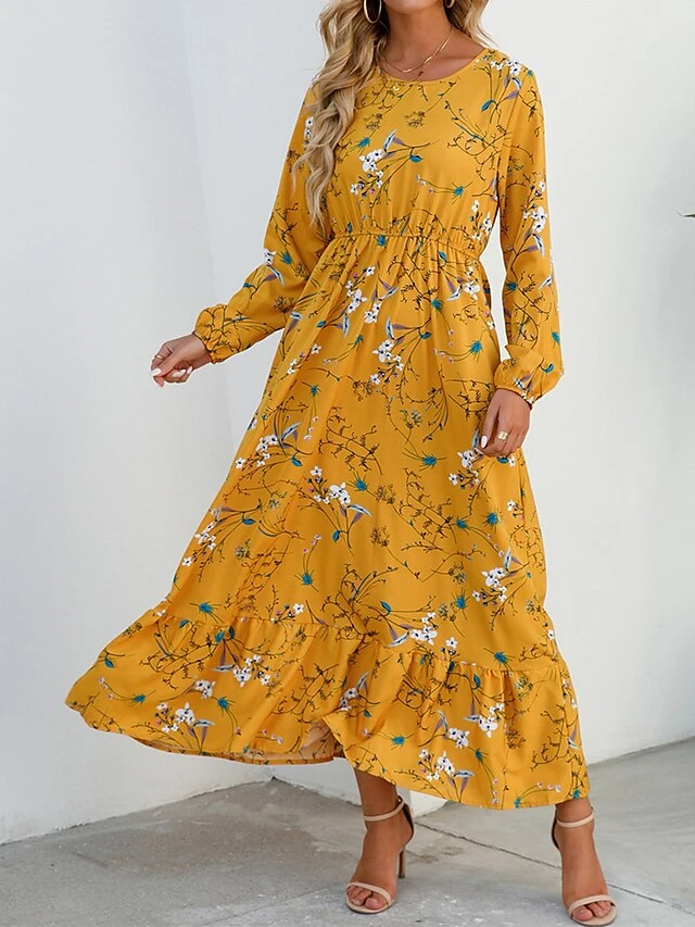 Women’s Casual Dress Swing Dress A Line Dress Floral Print Crew Neck Long Dress Maxi Dress Fashion Modern Daily Holiday Long Sleeve Regular Fit Black White Yellow Fall Winter S M L XL