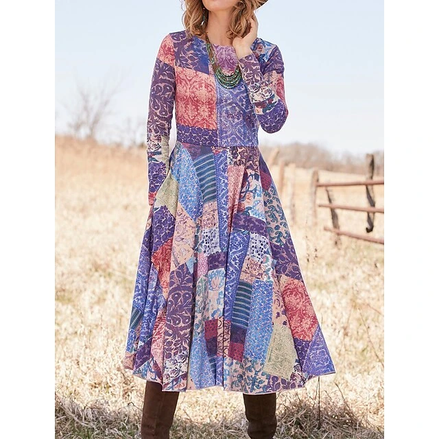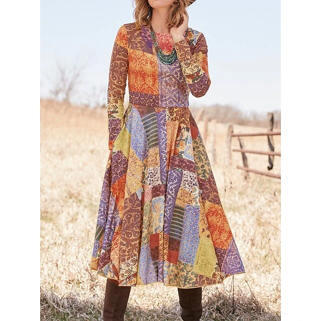 Women’s Casual Dress Swing Dress A Line Dress Geometric Color Block Pocket Print Crew Neck Midi Dress Fashion Streetwear Outdoor Daily Long Sleeve Regular Fit Yellow Blue Purple Spring Fall S M L XL