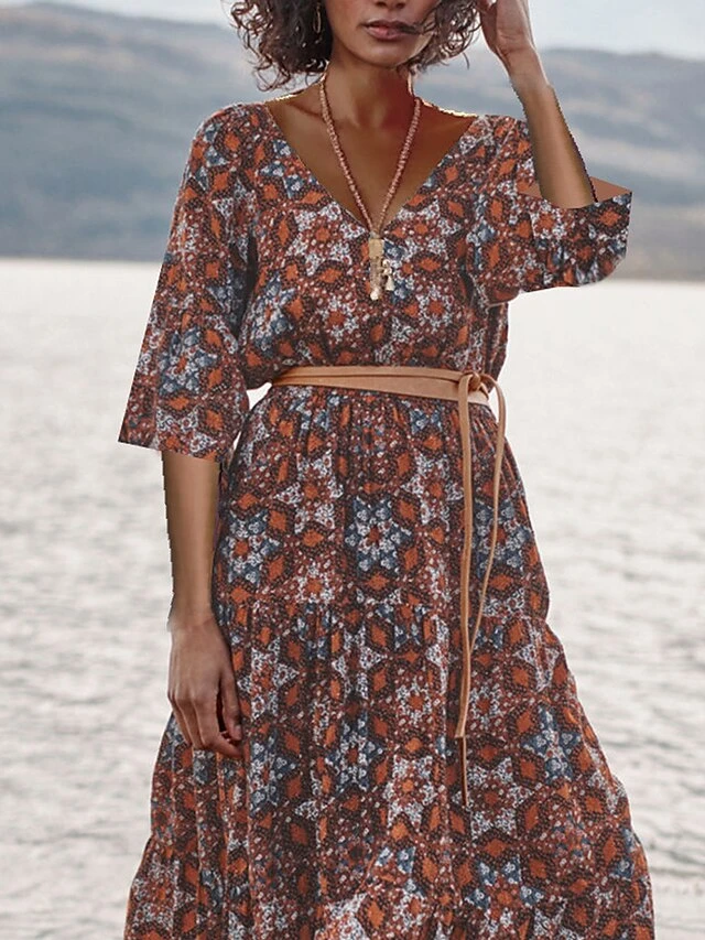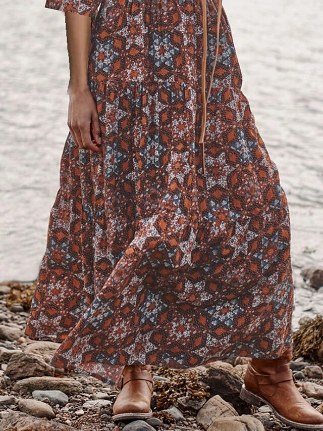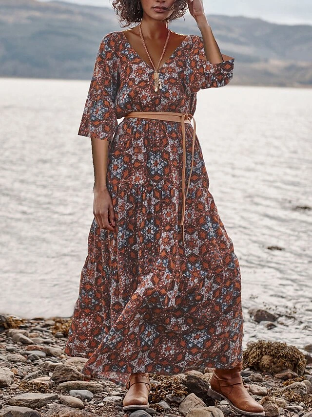 Women’s Casual Dress Swing Dress Print Dress Floral Print V Neck Long Dress Maxi Dress Fashion Streetwear Outdoor Daily 3/4 Length Sleeve Loose Fit Red Fall Winter S M L XL XXL
