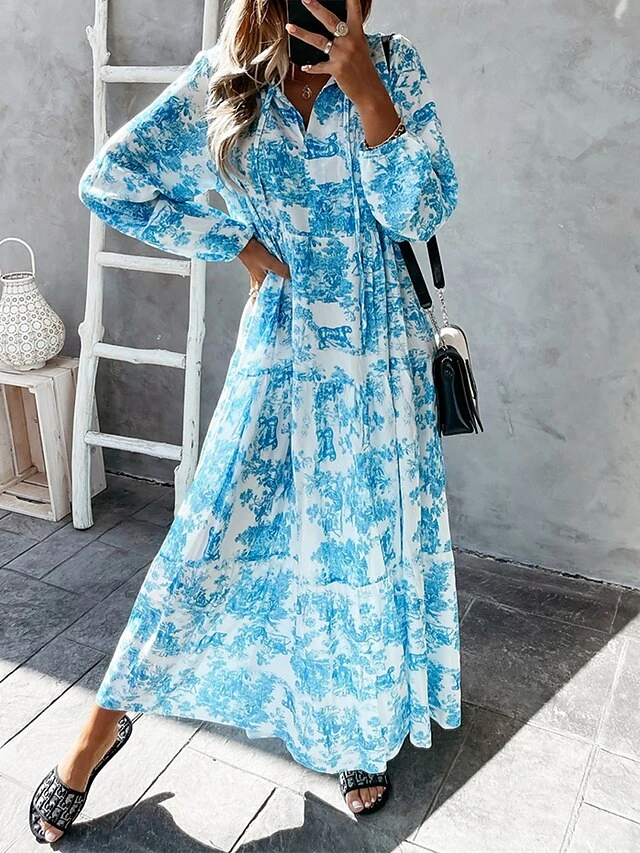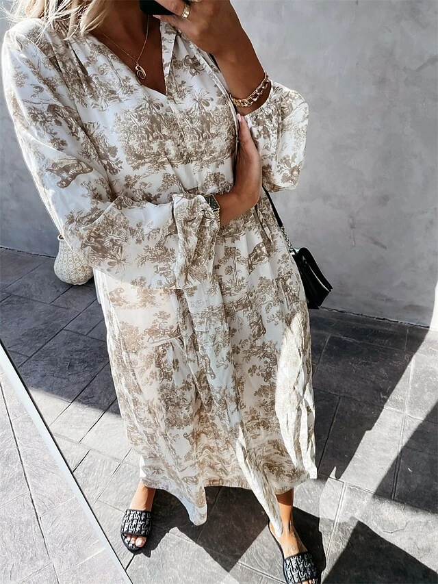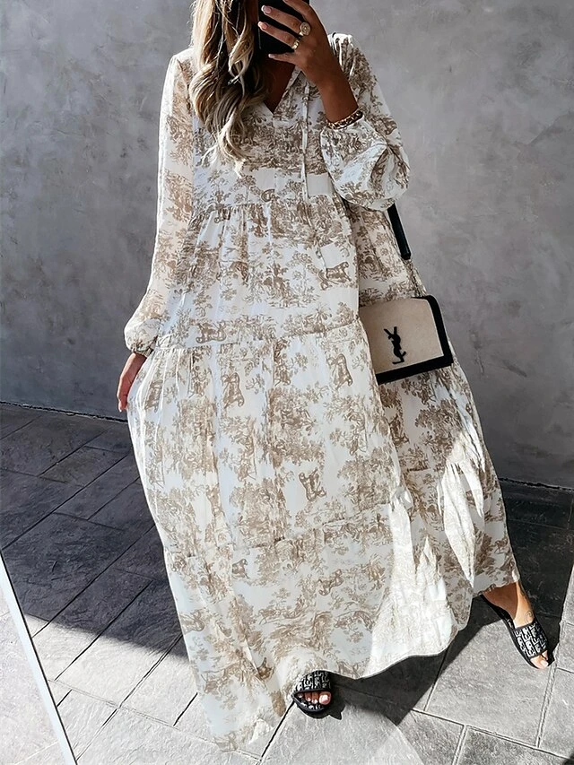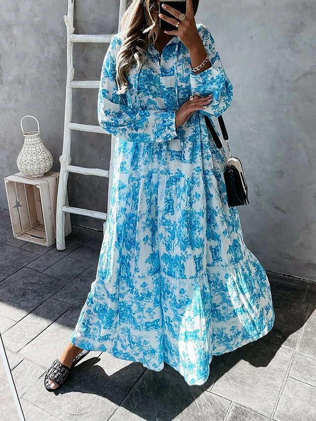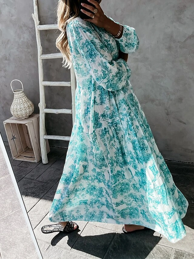 Women’s Casual Dress Swing Dress Print Dress Floral Ruched Print V Neck Long Dress Maxi Dress Fashion Streetwear Outdoor Street Long Sleeve Loose Fit Red Blue Green Fall Winter S M L XL XXL
