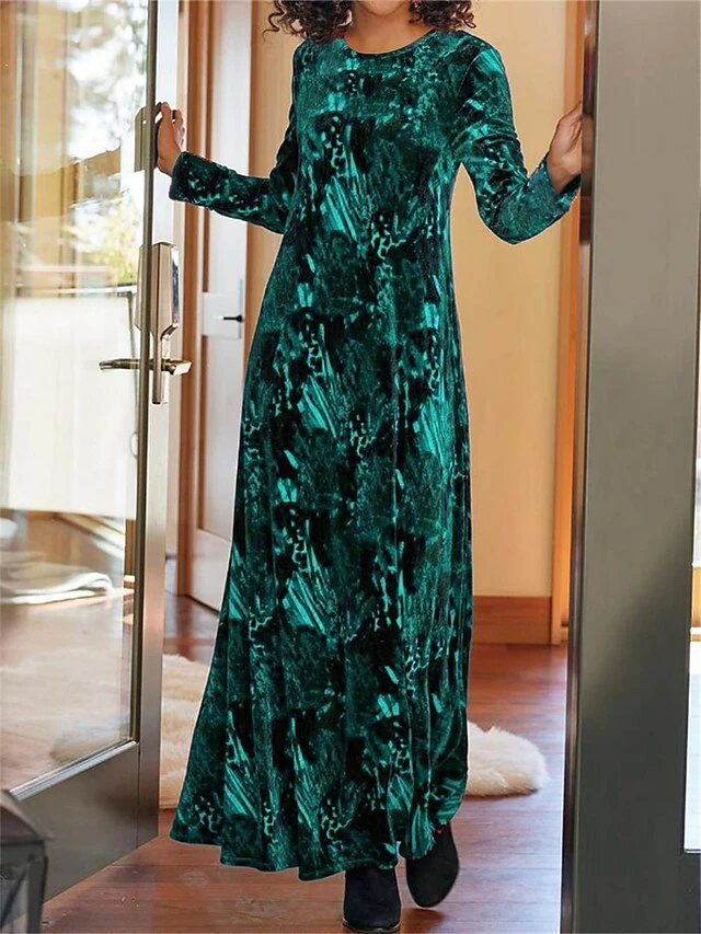 Women’s Casual Dress Velvet Dress Winter Dress Floral Pocket Print Crew Neck Long Dress Maxi Dress Fashion Streetwear Outdoor Daily Long Sleeve Loose Fit Yellow Wine Blue Fall Winter S M L XL XXL