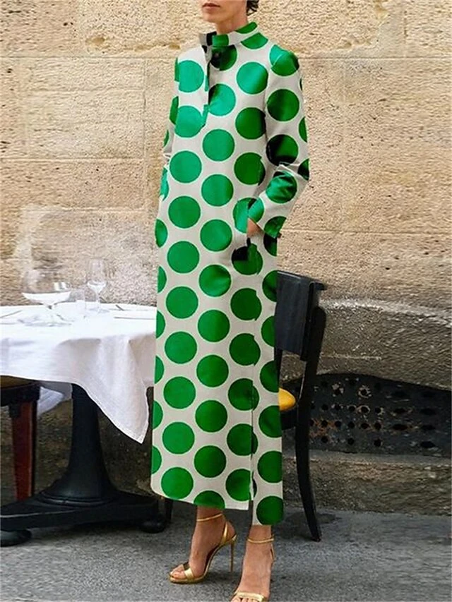 Women’s Casual Dress Winter Dress Print Dress Polka Dot Stripe Button Pocket Stand Collar Long Dress Maxi Dress Fashion Classic Outdoor Daily Long Sleeve Loose Fit Black Yellow Green Fall Winter S M