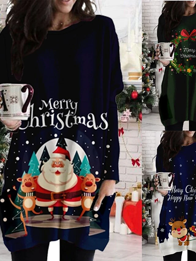 Women’s Christmas Casual Dress Shift DressShort Mini Dress Green Blue Black Long Sleeve Tree Print Hat Print Fall Winter Crew Neck Party Casual 2022 XS S M L XL 2XL 3XL 4XL