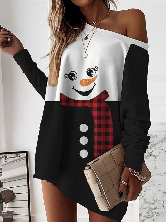 Women‘s Christmas Casual Dress Sweatshirt Dress Mini Dress Warm Fashion Outdoor Holiday Crew Neck Print Santa Claus Snowman Loose Fit Black White Blue S M L XL XXL