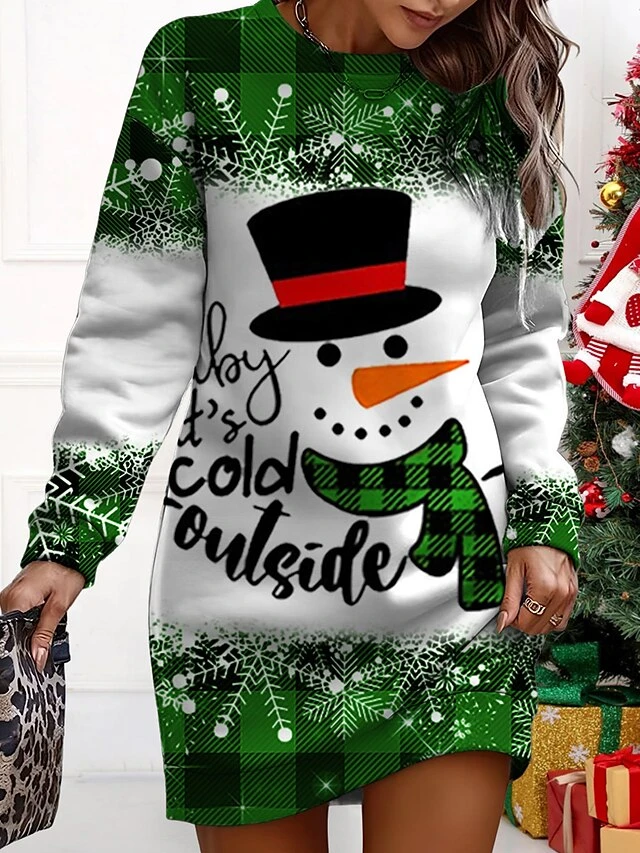 Women‘s Christmas Casual Dress Sweatshirt Dress Mini Dress Warm Fashion Outdoor Holiday Crew Neck Print Snowman Print Loose Fit Wine Red Purple S M L XL XXL