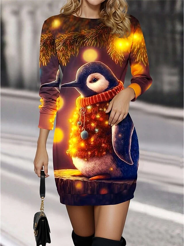 Women’s Christmas Dress Casual Dress Mini Dress Warm Fashion Outdoor Christmas Vacation Crew Neck Print Snowman Regular Fit Yellow Blue S M L XL XXL
