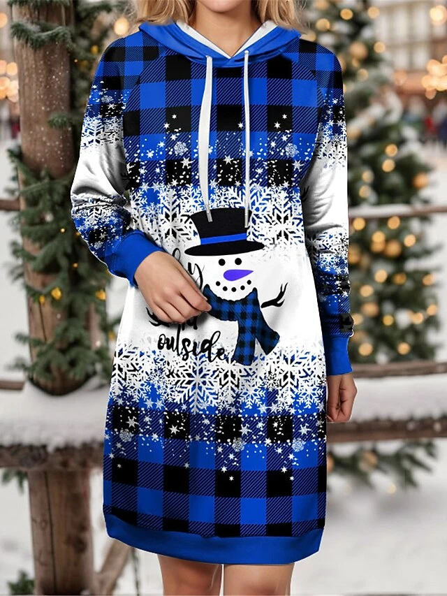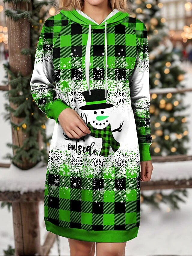 Women’s Christmas Dress Hoodie Dress Mini Dress Warm Fashion Outdoor Christmas Holiday Hoodie Print Snowman Snowflake Loose Fit Wine Blue Green S M L XL XXL