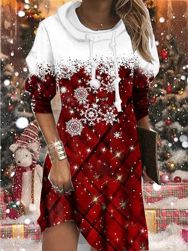 Women’s Christmas Hoodie Dress Shift Dress Mini Dress Green Blue Wine Long Sleeve Plaid Snowflake Print Winter Fall Hooded Vacation Casual 2022 S M L XL XXL 3XL