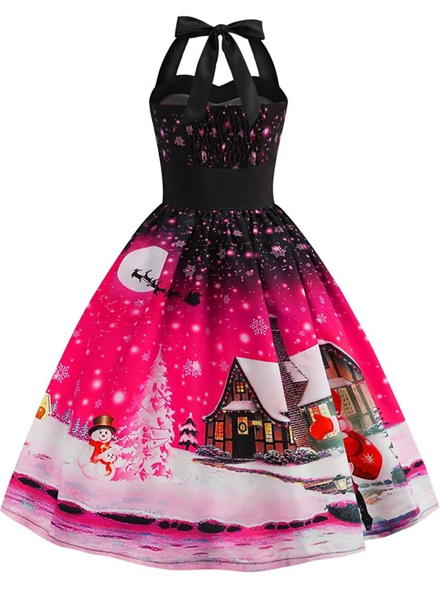 Women’s Christmas Knee Length Dress Blue Purple Blushing Pink Red Sleeveless Print Lace Up Print Fall Summer Halter Neck VintageParty Slim 2021 S M L XL XXL