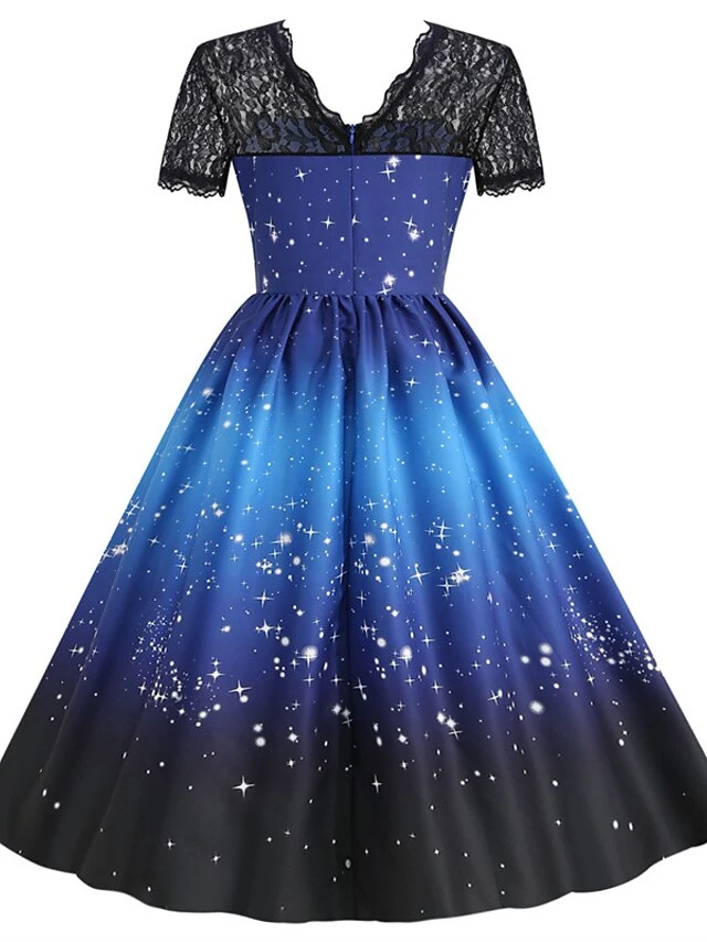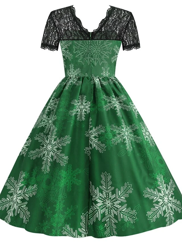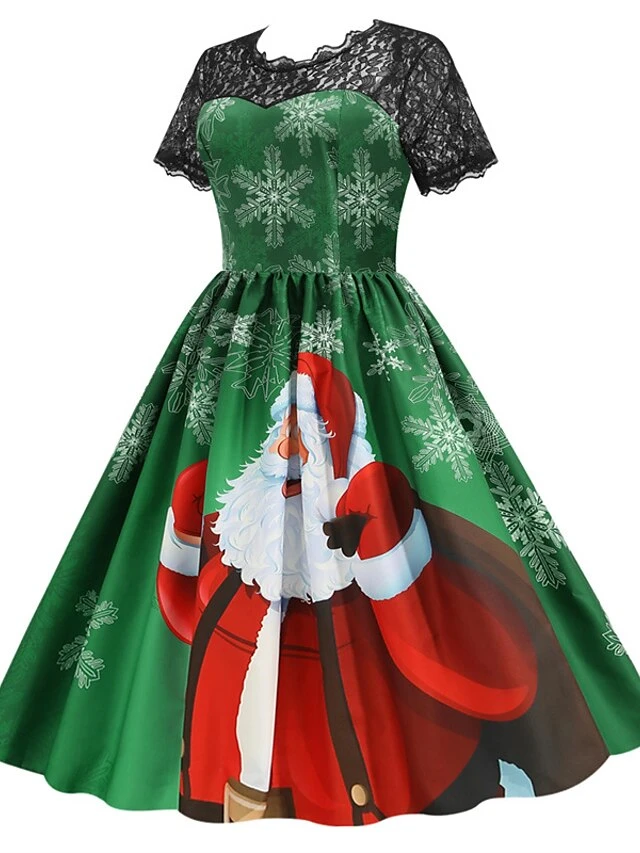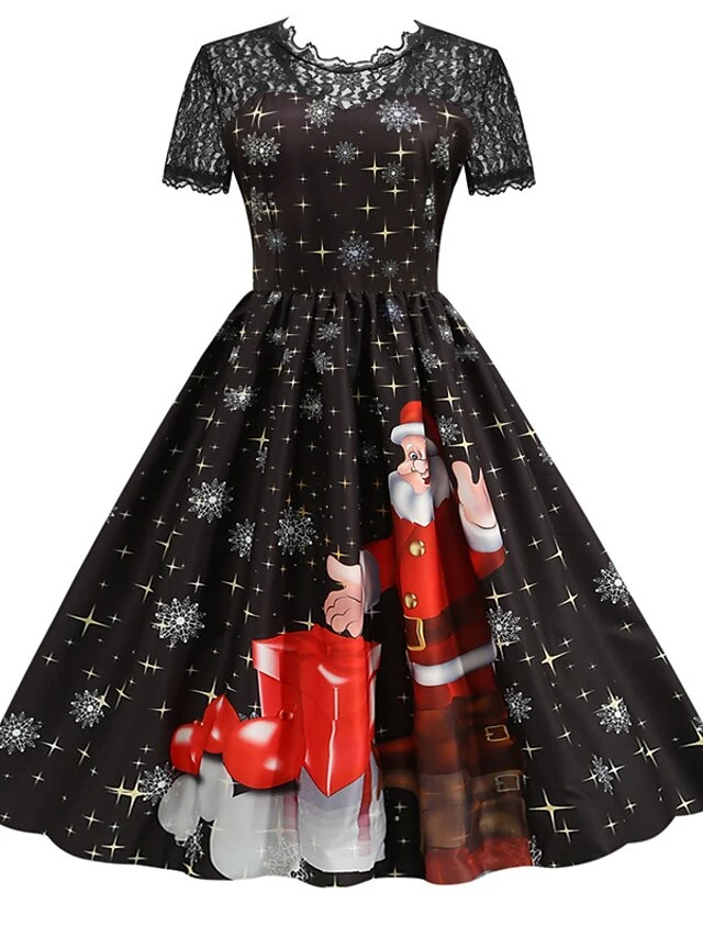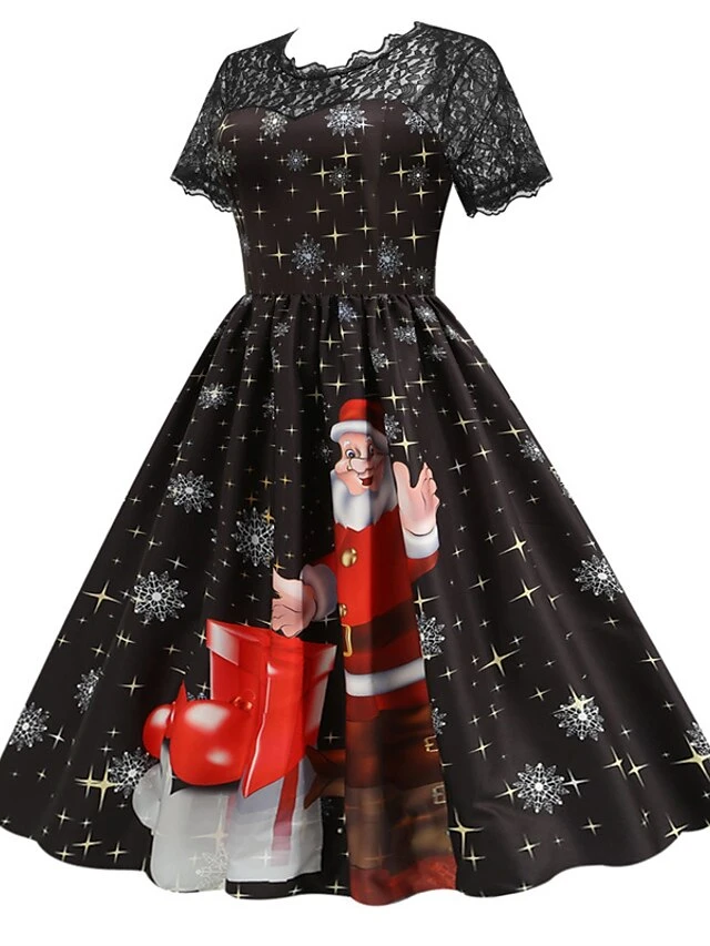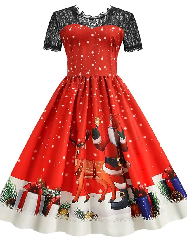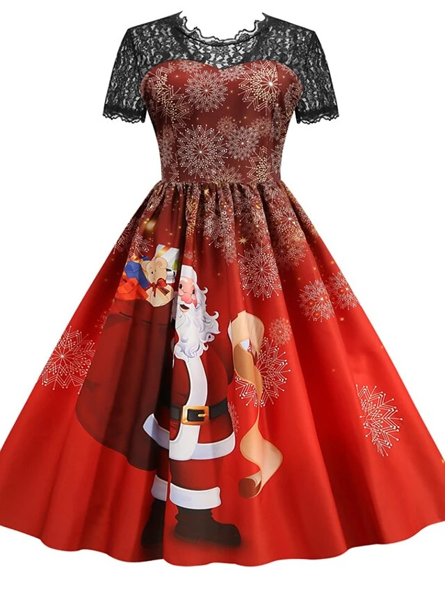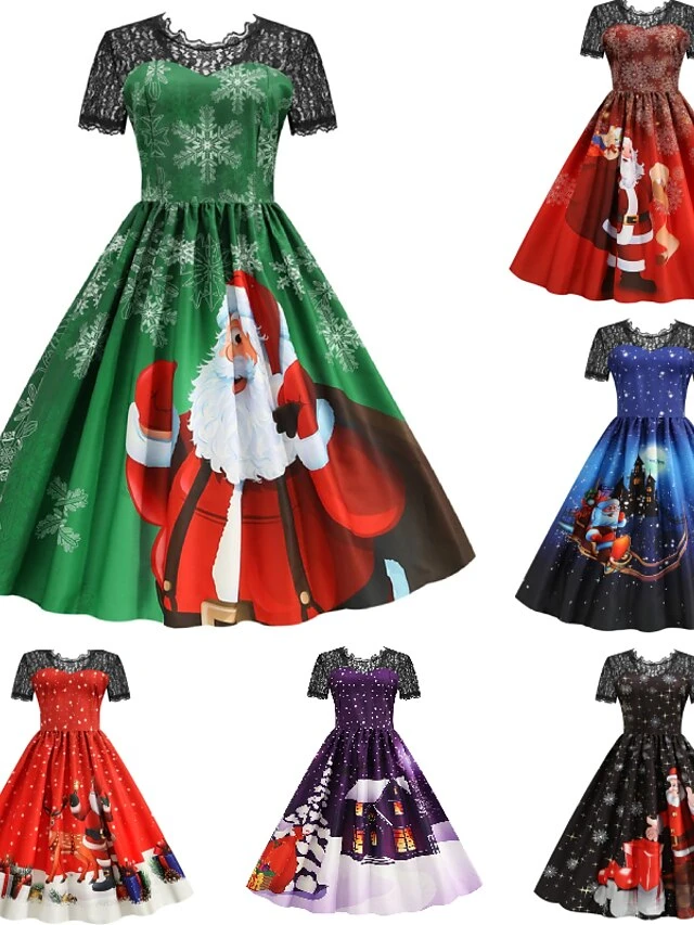 Women’s Christmas Knee Length Dress Blue Purple Wine Green Black Red Short Sleeve Print Lace Print Fall Winter Round Neck CasualRegular Fit 2021 S M L XL XXL 3XL