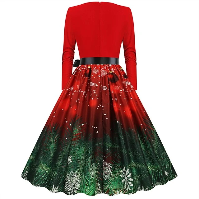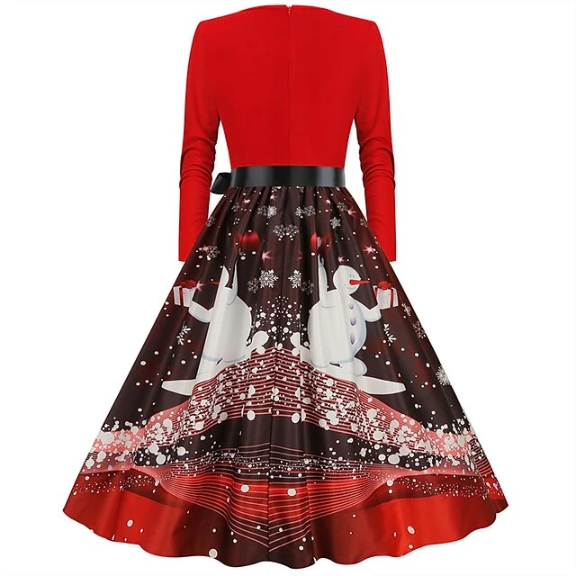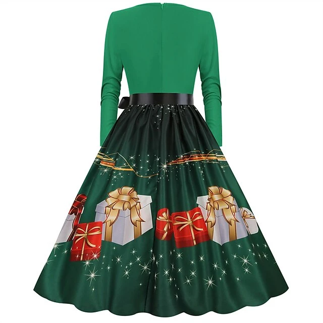 Women’s Christmas Party Dress Swing DressKnee Length Dress Green Wine Dark Green Red Black Long Sleeve Santa Claus Elk Snowman Print Fall Winter V Neck Vintage Party Elegant Party 2022 S M L XL XXL