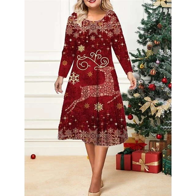 Women’s Christmas Plus Size Curve Casual Dress Skater Dress A Line Dress Elk Snowflake Midi Dress Long Sleeve Print Crew Neck Fashion Outdoor Wine Purple Fall Winter L XL XXL 3XL 4XL