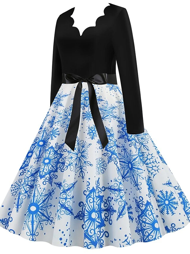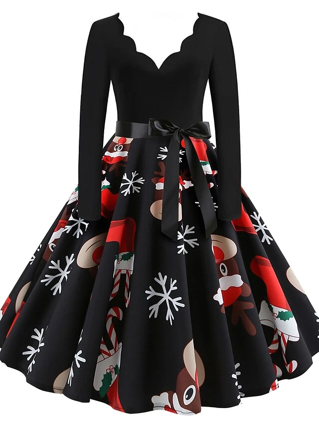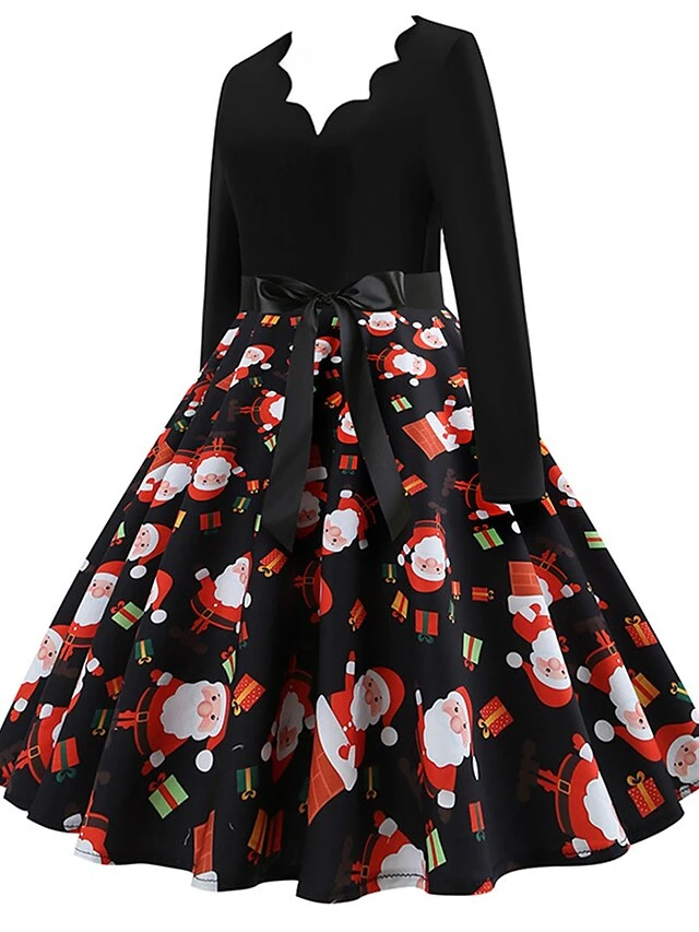 Women’s Christmas Retro 1950s Vintage Dress Midi Dress Party Ruched Bow Fruit V Neck Long Sleeve Regular Fit Fall Winter 2023 Deep Green Black S M L XL