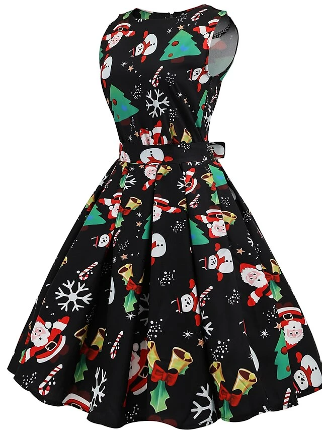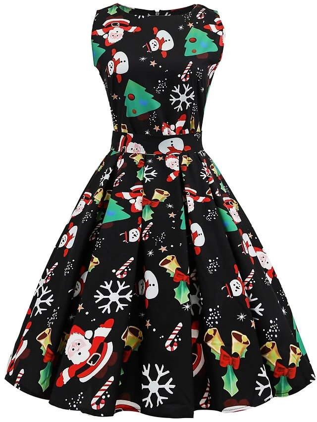 Women’s Christmas Swing Dress Knee Length Dress Black SleevelessSnowman Candy Zipper Bow Print Fall Spring Round Neck VintageParty 2021 S M L XL XXL XXXL
