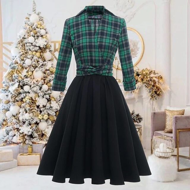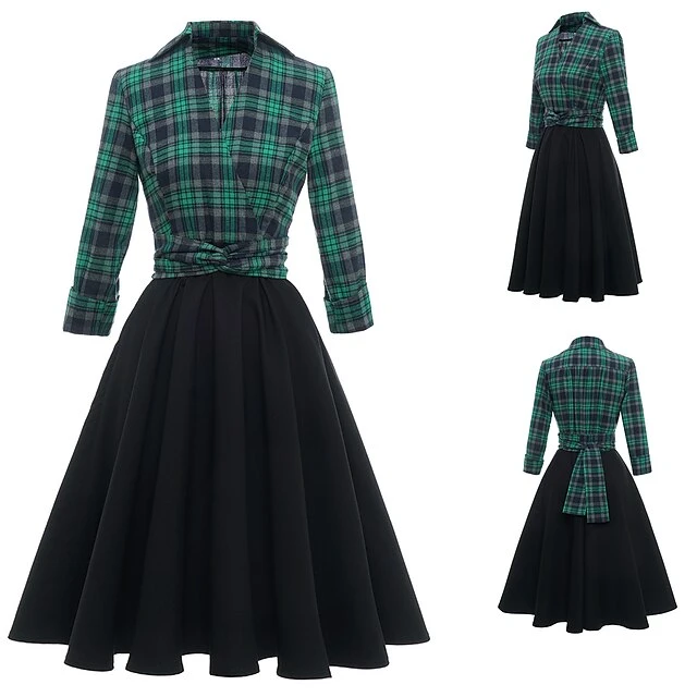 Women‘s Christmas Tartan Dress Vintage Dress Mini Dress Green Long Sleeve Plaid Patchwork Print Winter Fall Shirt Collar Vintage Casual Traditional Fall Dress 2022 S M L XL 2XL / Winter Dress
