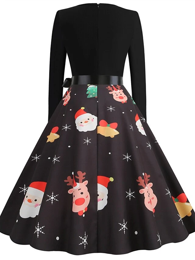 Women’s Christmas Vintage Dress Midi Dress Black And White Green Black Long Sleeve Santa Claus Bow Winter Fall Autumn Square Neck Stylish Christmas Vacation 2022 S M L XL XXL 3XL