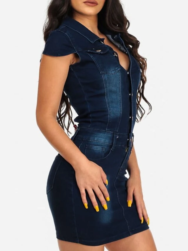 Women’s Denim Dress Denim Shirt Dress Mini Dress Cotton Denim Modern Formal Daily Vacation Dress Shirt Collar Pocket Short Sleeve Summer Spring 2023 Slim Navy Blue Pure Color S M L XL XXL