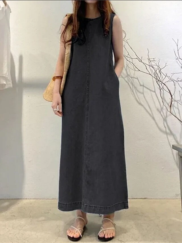 Women’s Denim Dress Shift Dress Maxi Long Dress Denim Modern Casual Vacation Crew Neck Patchwork Sleeveless Summer Spring 2023 Regular Fit Black Royal Blue Blue Pure Color S M L XL 2XL