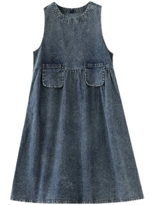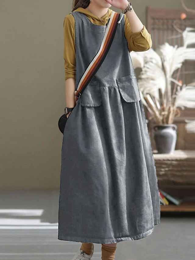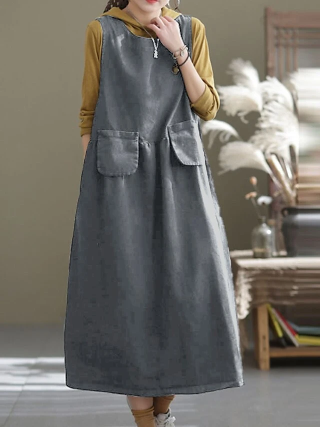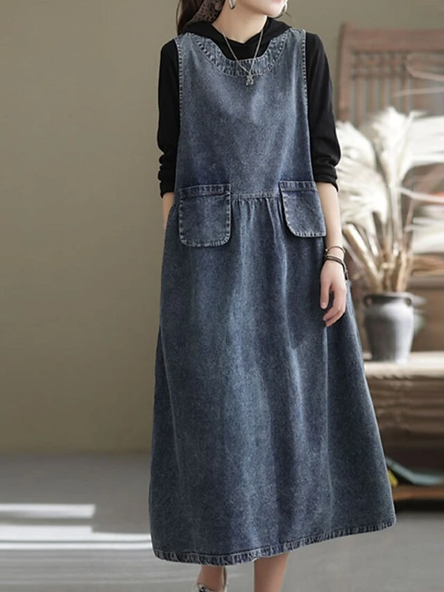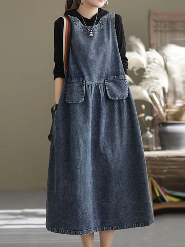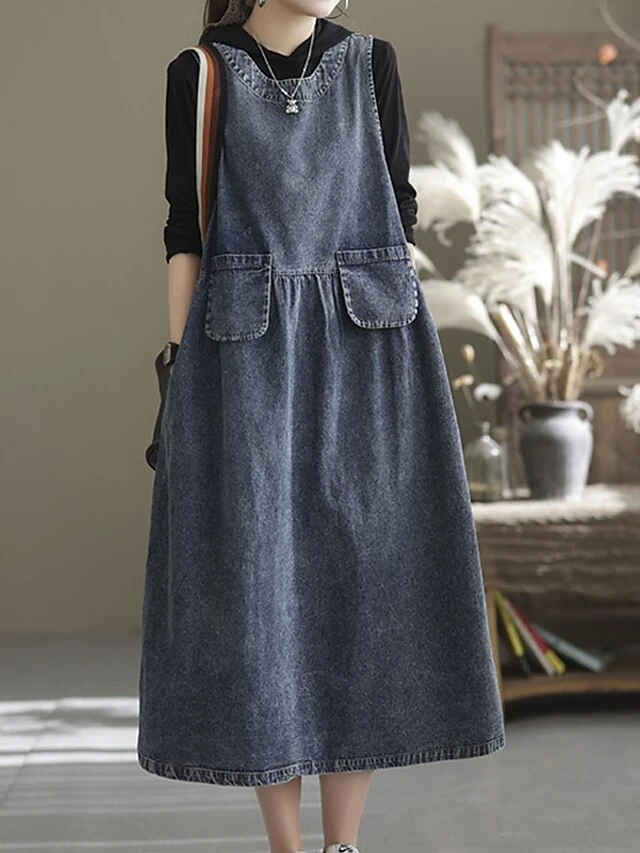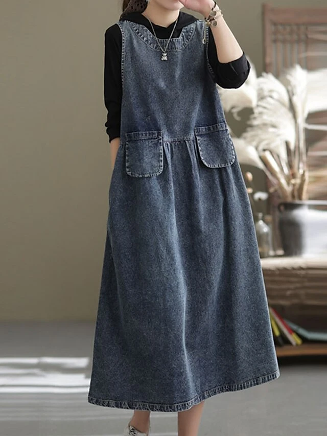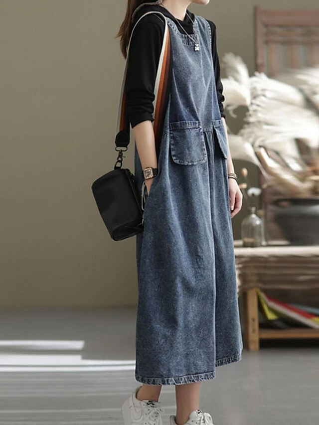 Women’s Denim Dress Swing Dress Denim Overall Pinafore Dress Maxi Long Dress Cotton Denim Casual Daily Holiday Vacation Crew Neck Pocket Sleeveless Summer Spring 2023 Loose Fit Black Blue Pure Color