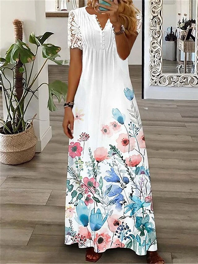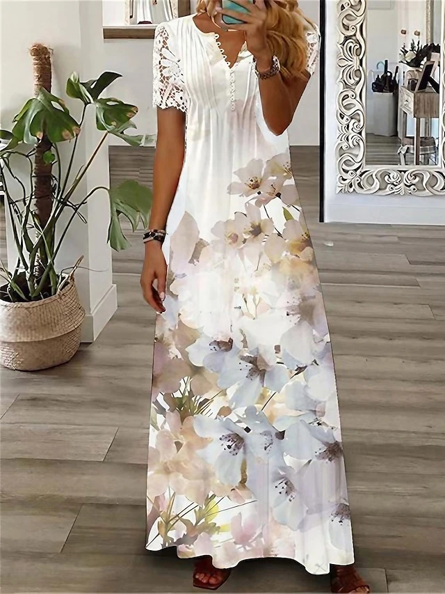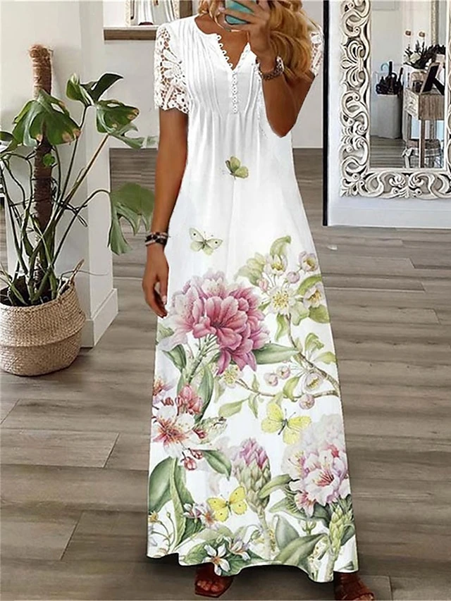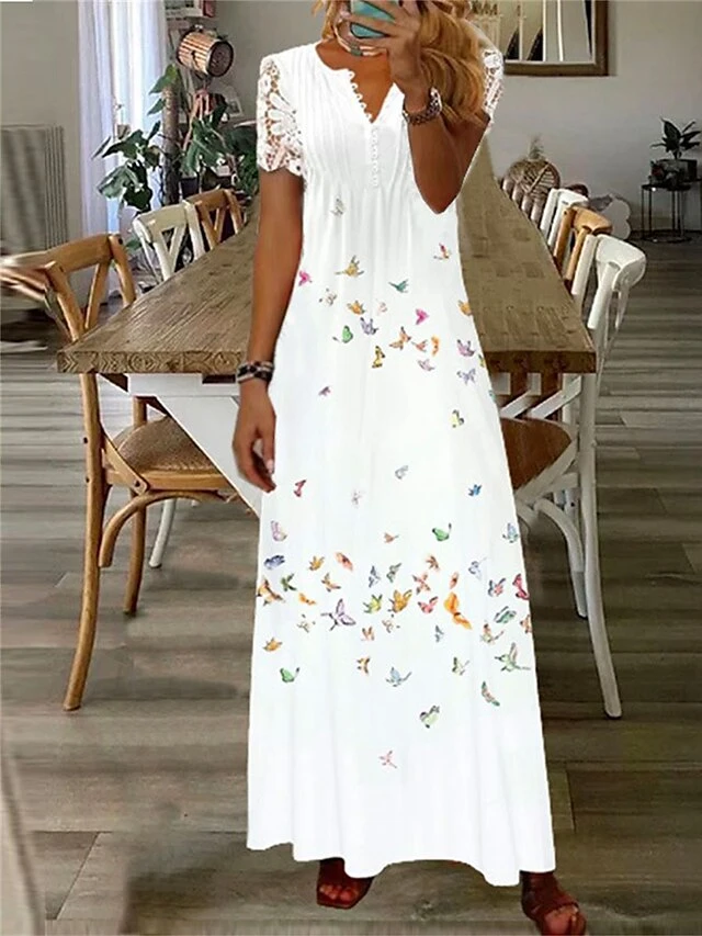 Women’s Long Dress Maxi Dress Casual Dress Summer Dress Print Dress Floral Butterfly Fashion Streetwear Outdoor Daily Date Lace Print Short Sleeve V Neck Dress Loose Fit White Blue Green Summer Spring