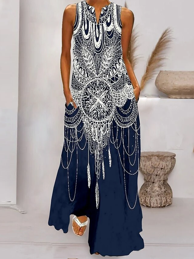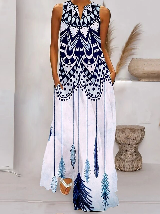 Women’s Long Dress Maxi Dress Casual Dress Swing Dress Print Dress Feather Casual Romantic Holiday Vacation Beach Pocket Print Sleeveless V Neck Dress Loose Fit White Navy Blue Light Sky Blue Spring
