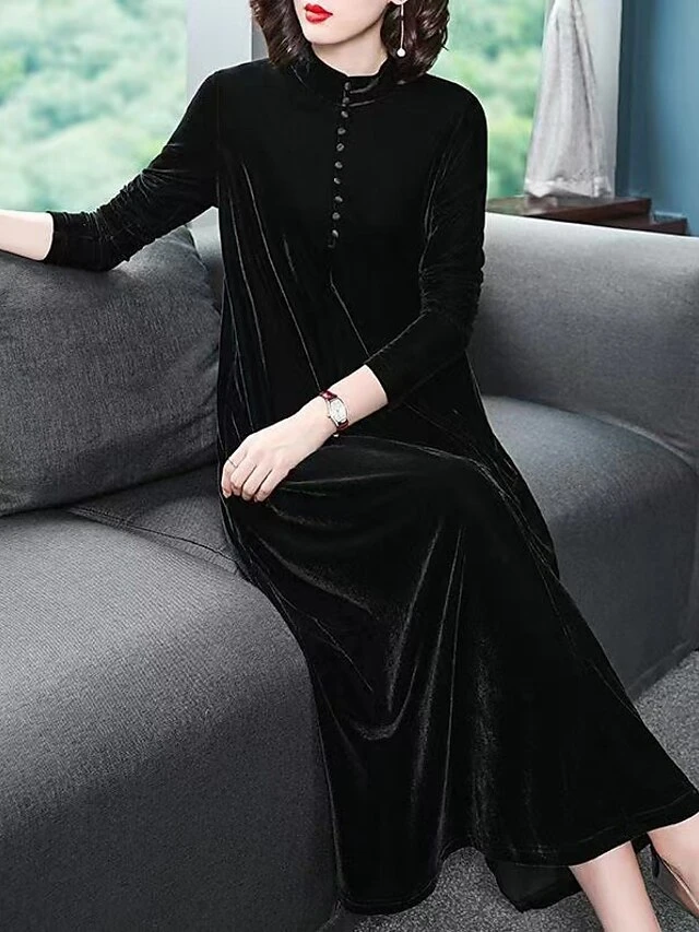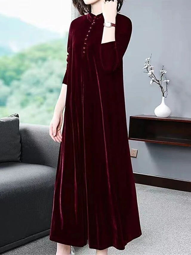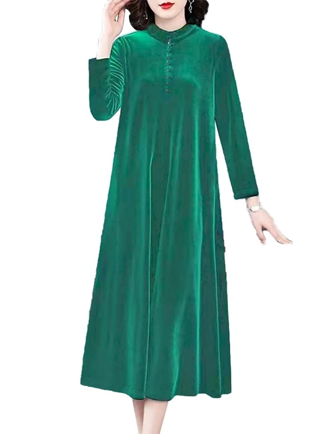 Women’s Party Dress Velvet Dress Emerald Green Dress Midi Dress Black Wine Purple Long Sleeve Pure Color Button Fall Spring Crew Neck Stylish Winter Dress Weekend Fall Dress 2023 M L XL XXL 3XL 4XL