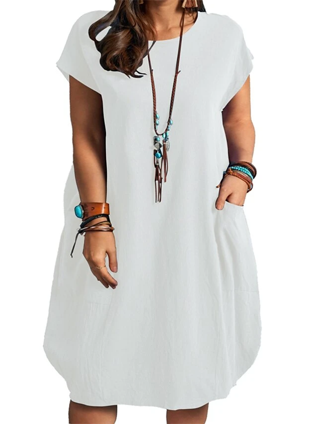 Women’s Plus Size Apple Shaped Dress Curve Shift Dress Solid Color Round Neck Short Sleeve Spring Summer Casual Knee Length Dress Casual Daily Dress