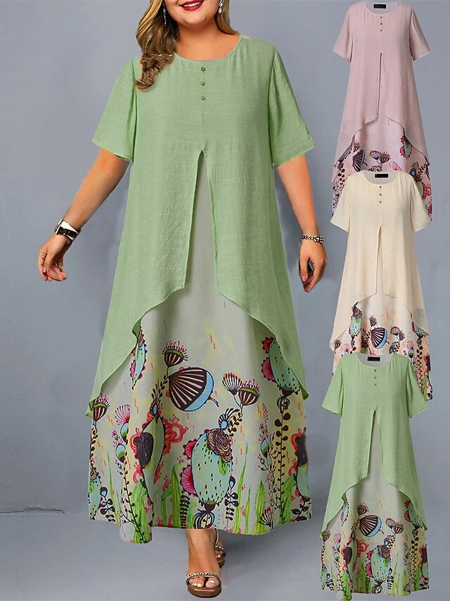 Women‘s Plus Size Curve Apple Shaped Dress Casual Dress A Line Dress Graphic Long Dress Maxi Dress Short Sleeve Fake Two Piece Print Crew Neck Fashion Daily Pink Green Spring Summer Dress